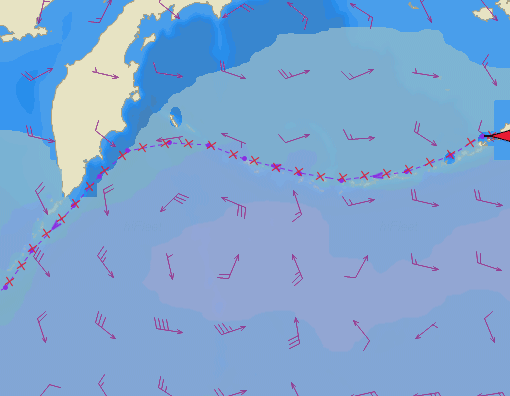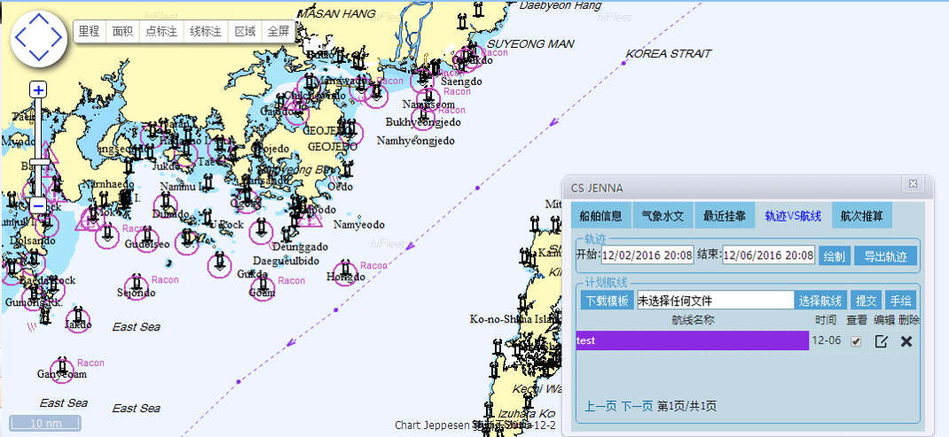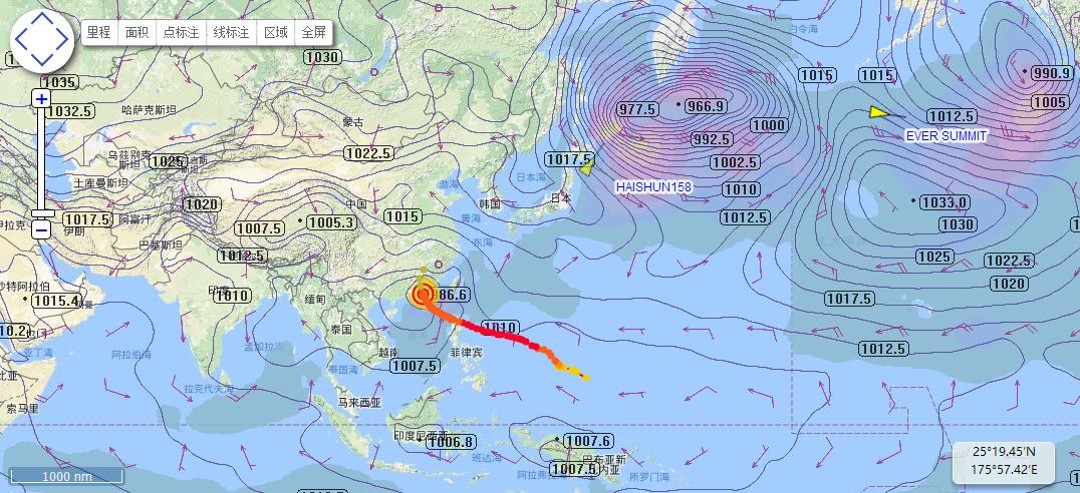 气象传真图时间间隔6小时,7天预报。在播放气象传真图的时候,自动沿计划航线推算船位,可再航次推算页面上设定航行速度。这样,可以预测未来的船位和当时的气象海况。台风季节,也可以通过点击台风预报位置,推算本船船位,掌握台风与本船的相对态势