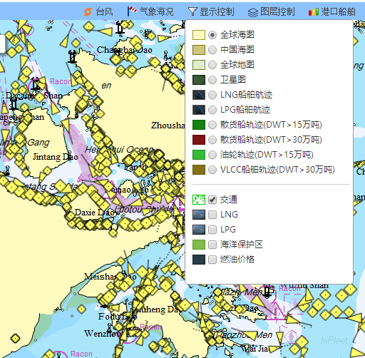 可以在图层控制中选中“交通”,则可以显示全部船舶