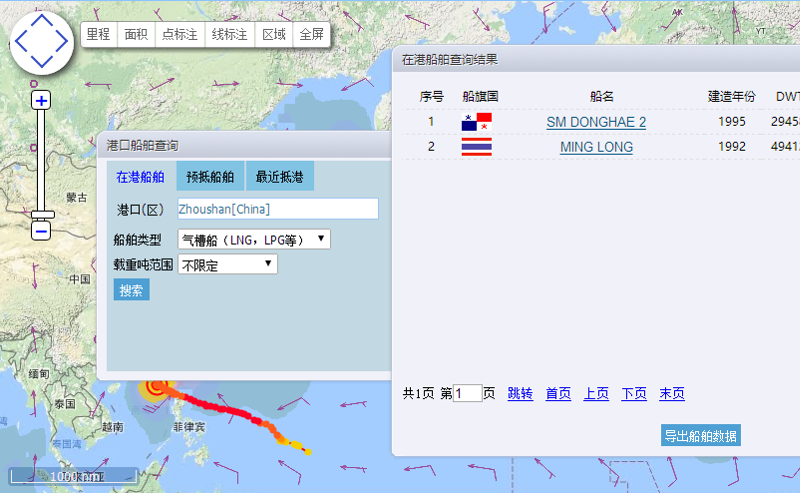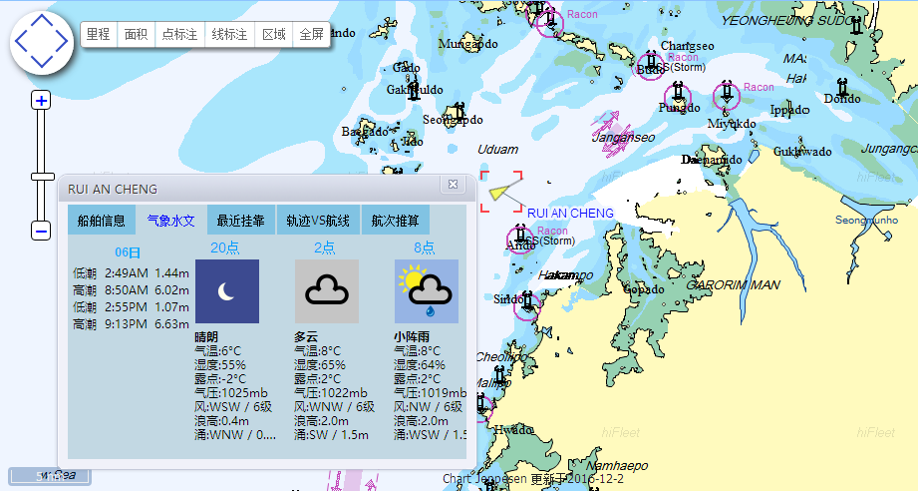 点击船舶“气象水文”,可以看到船舶位置处的气象预报数据和潮汐预报数据