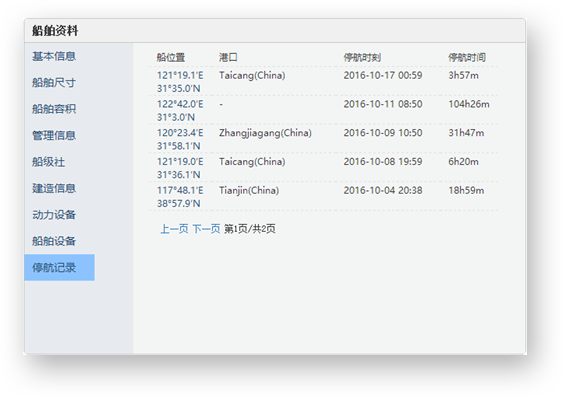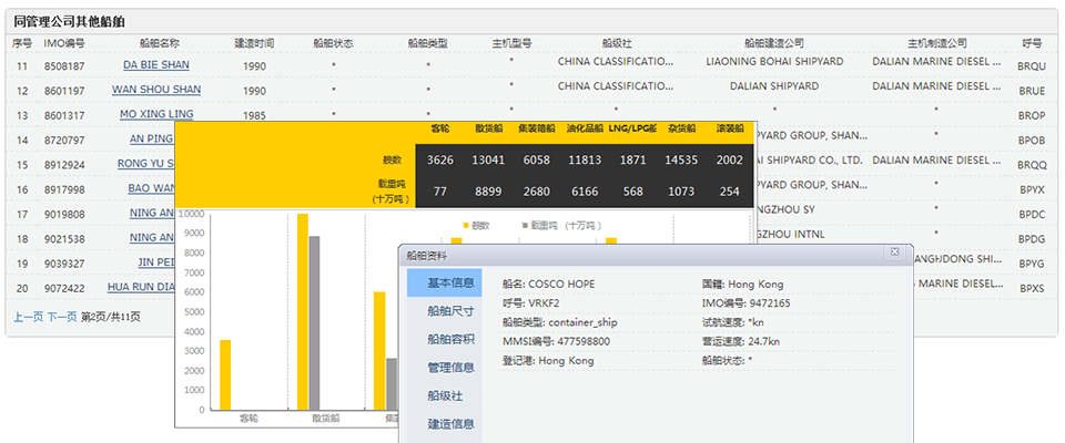 全球外贸船舶档案可为用户提供船舶尺寸、容积、船东、管理公司、船级社、设备等200多项船舶信息。