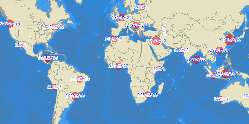 7种船舶类型停船5天及以上的船舶分布,格式为总载重吨/艘数,每6个小时更新一次。